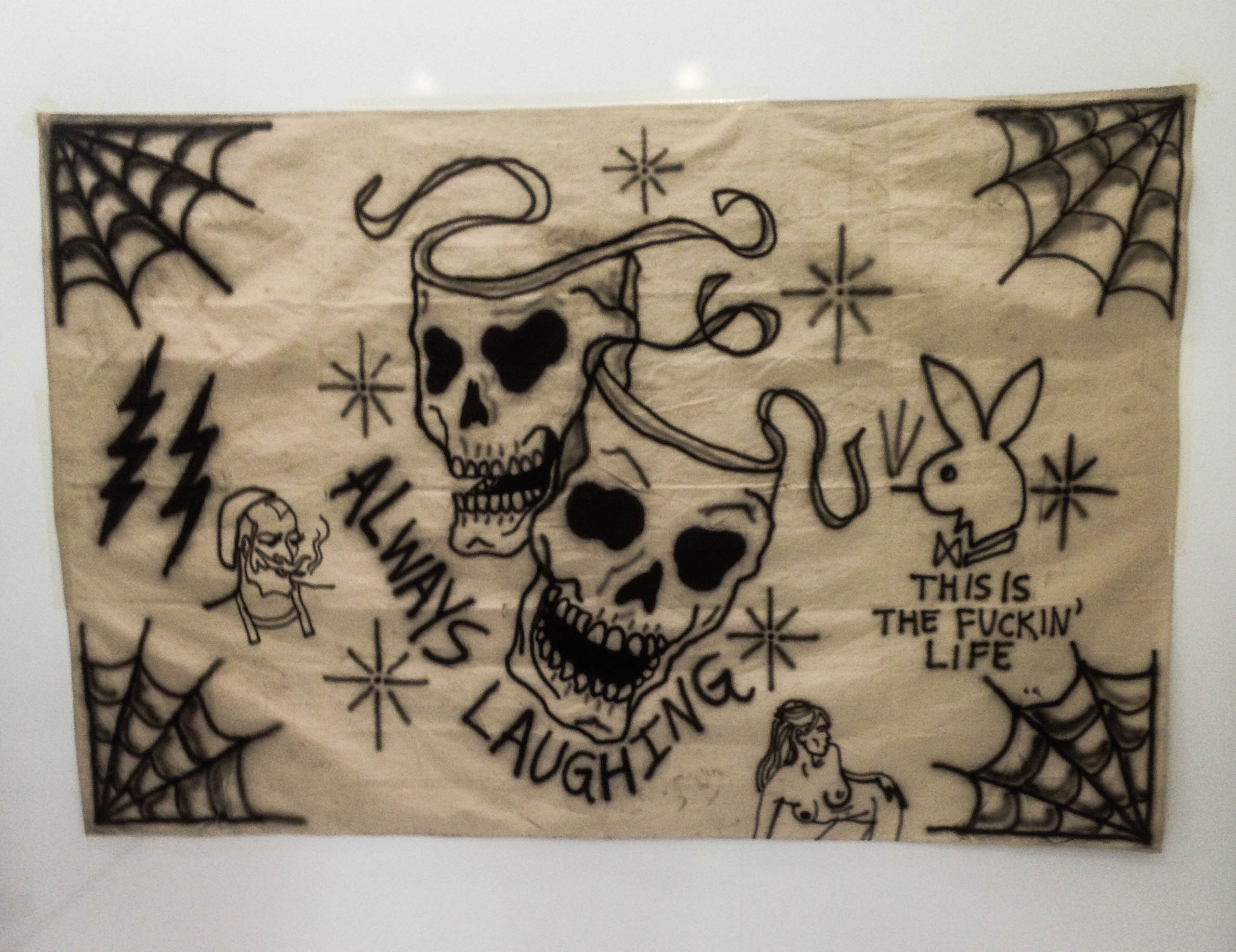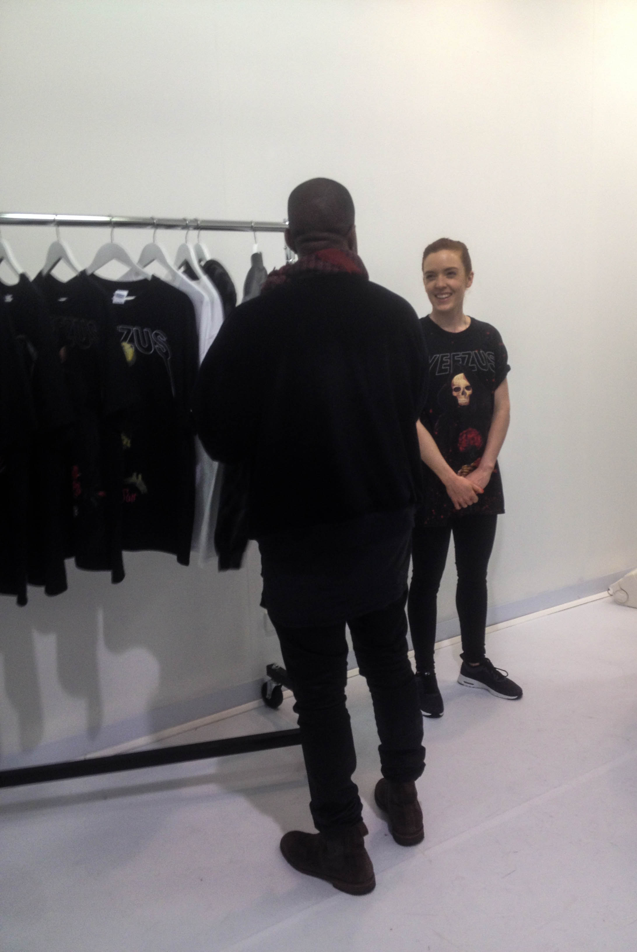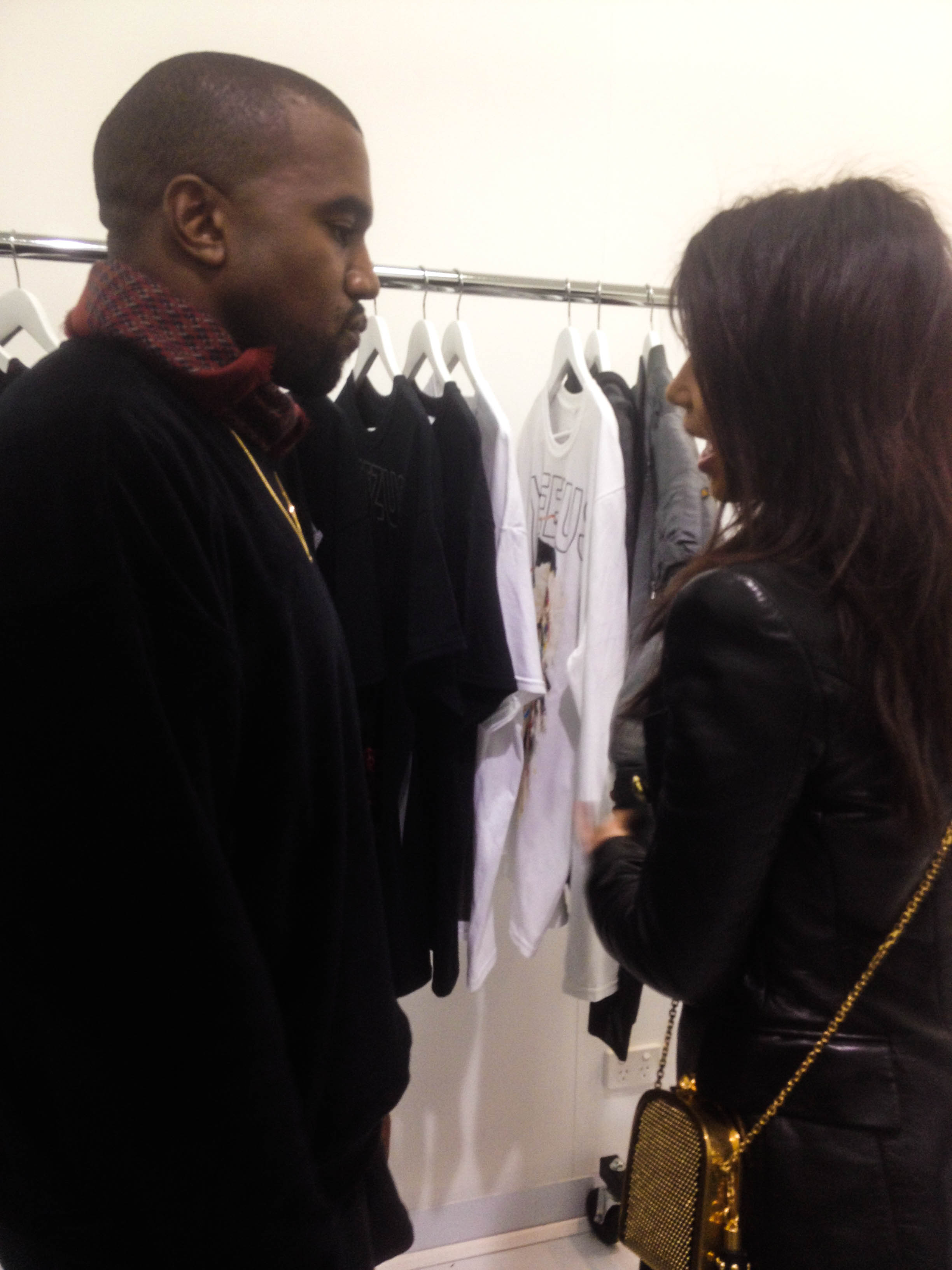 Kanye walks over to Kim as I’m talking to her probably thinking ‘whats this nigga doing talking to my woman’. Eventually Kim walks off and its just me and Kanye standing there in front of the rack as he was checking out the different tees. I was generally curious so I asked what inspired the skulls/devil/demonic dark style and if it was inspired by anything in his music or his life now. Now I’m expecting some succinct, but really deep answer but all he simply said was