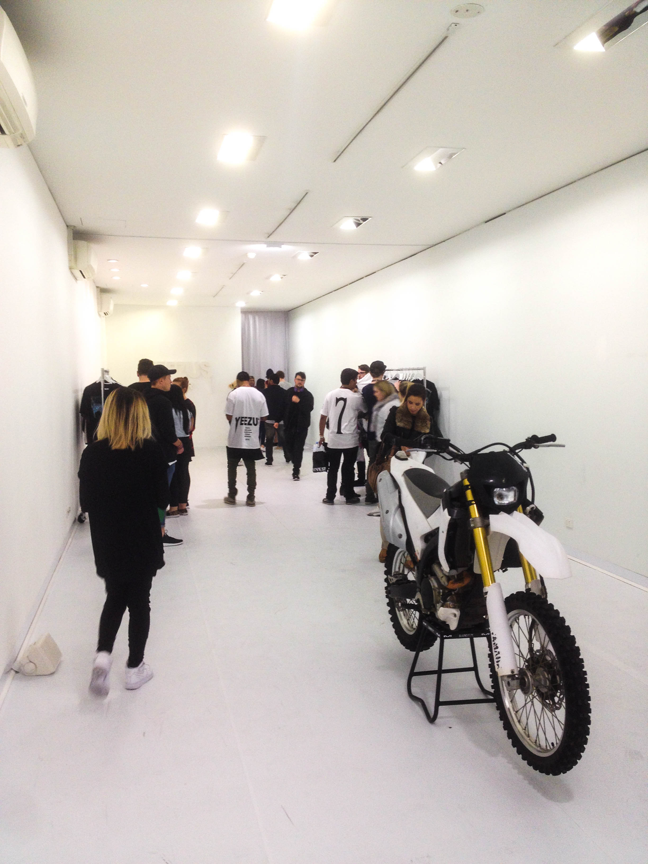 By the time we get I immediately notice the store is stark white from floor to ceiling, very minimalist and grunge at the same time. Very Yeezy – blended well with the aesthetic of the clothing line. A dirt bike sat in the middle of the floor for whatever crazy ass reason.